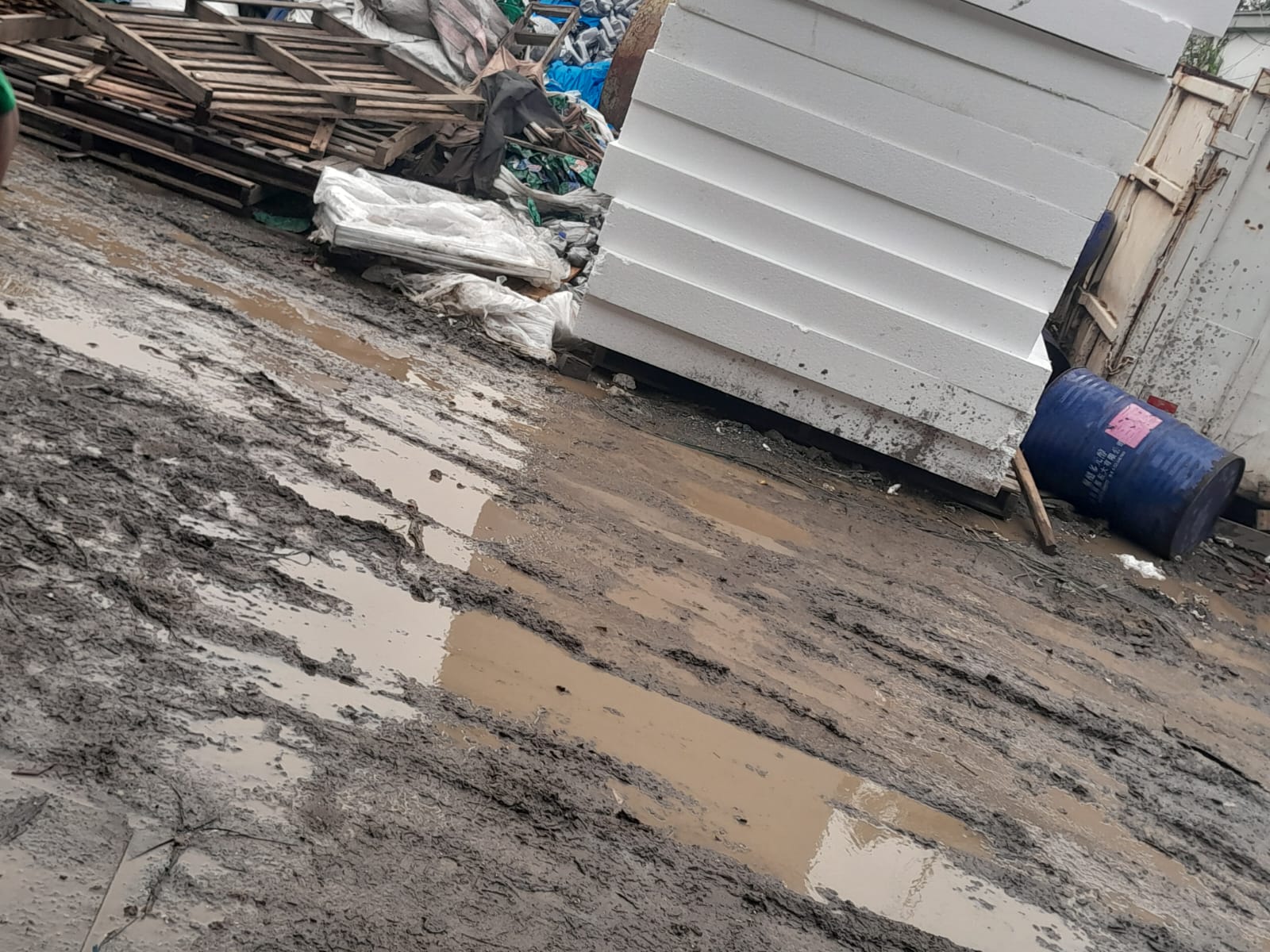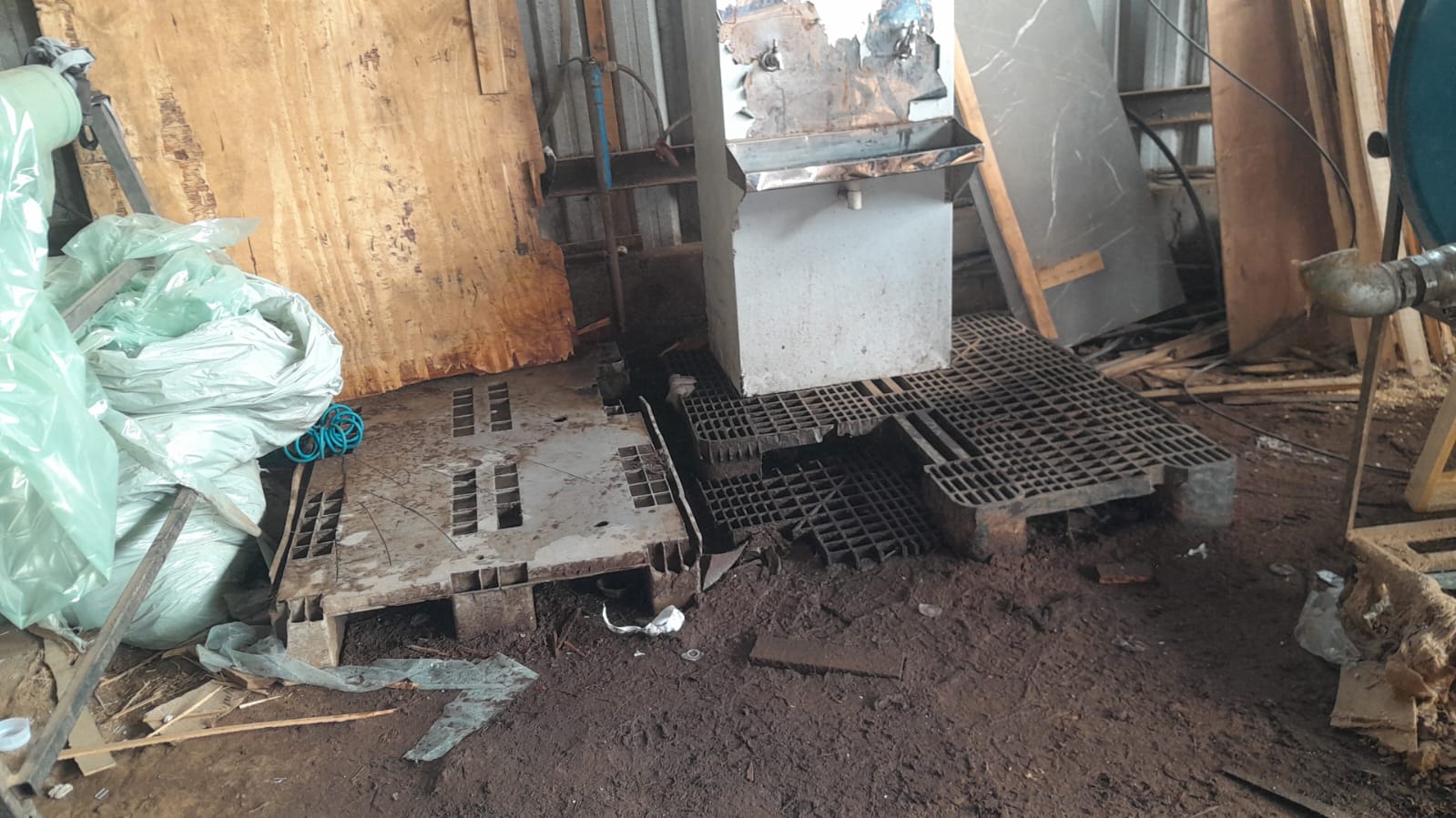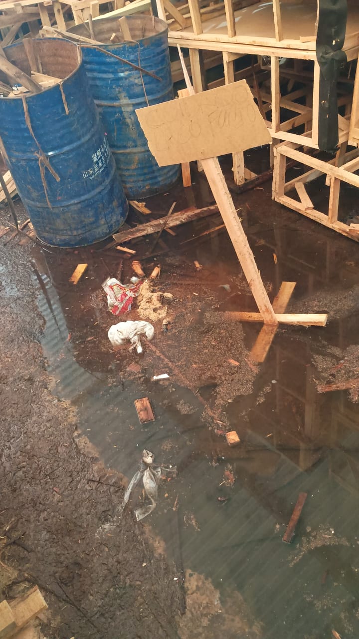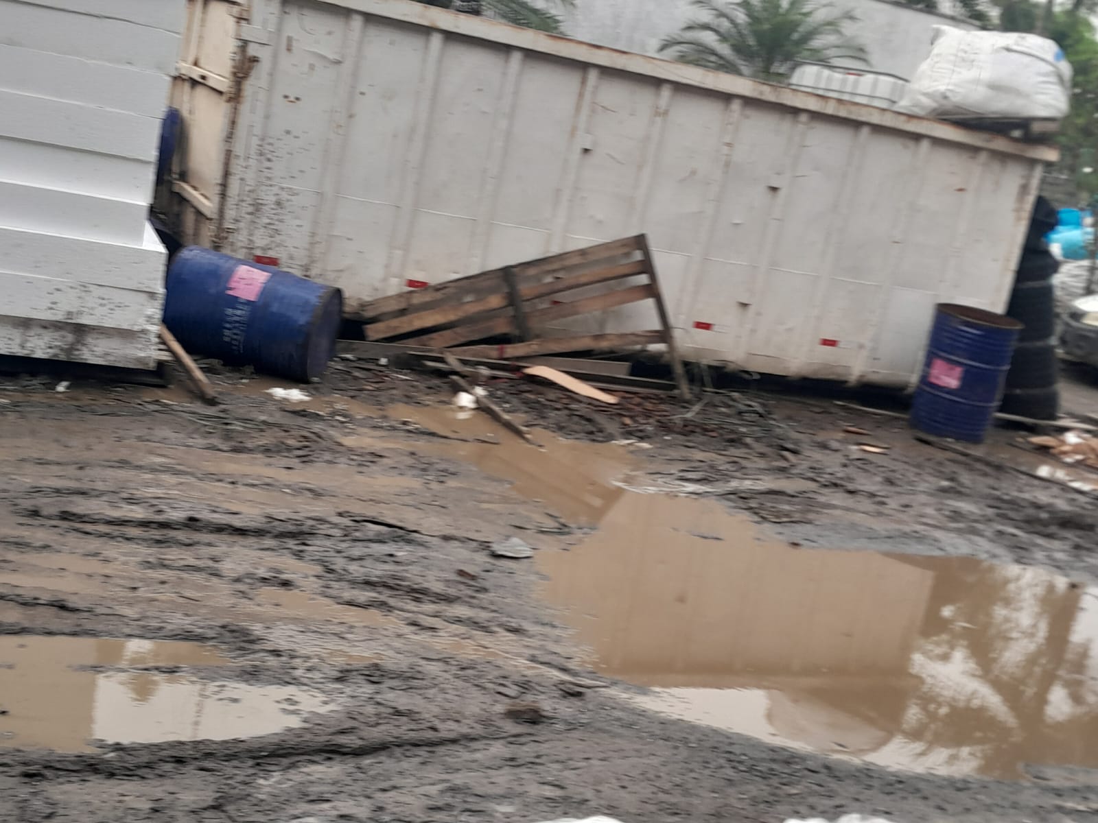 De acordo com o relato, o local estaria apresentando banheiros alagados, acúmulo de lama no entorno do galpão e estrutura considerada imprópria para a permanência dos trabalhadores. As informações são acompanhadas por imagens que, segundo a denúncia, ilustrariam as condições enfrentadas pelos funcionários no ambiente de trabalho.